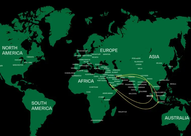 Menghubungkan Anda dengan mudah ke pusat Saudi Arabia, seperti Madinah Almunawarah dan Jeddah langsung dari Jakarta dan Medan.