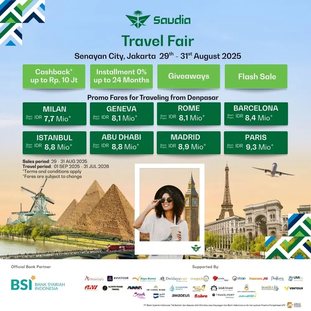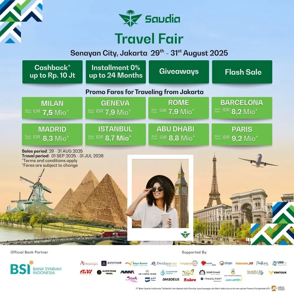 Jakarta, 18 Agustus 2025 — Saudia Airlines, maskapai nasional Kerajaan Arab Saudi, akan kembali menghadirkan Saudia Travel Fair (STVF) di Jakarta, sebuah ajang promosi perjalanan internasional yang dinanti oleh para pelancong dan mitra industri. Acara ini akan berlangsung pada tanggal 29 hingga 31 Agustus 2025 di Senayan City, menghadirkan berbagai penawaran eksklusif untuk perjalanan internasional dengan dukungan dari Bank Syariah Indonesia (BSI) sebagai mitra resmi.